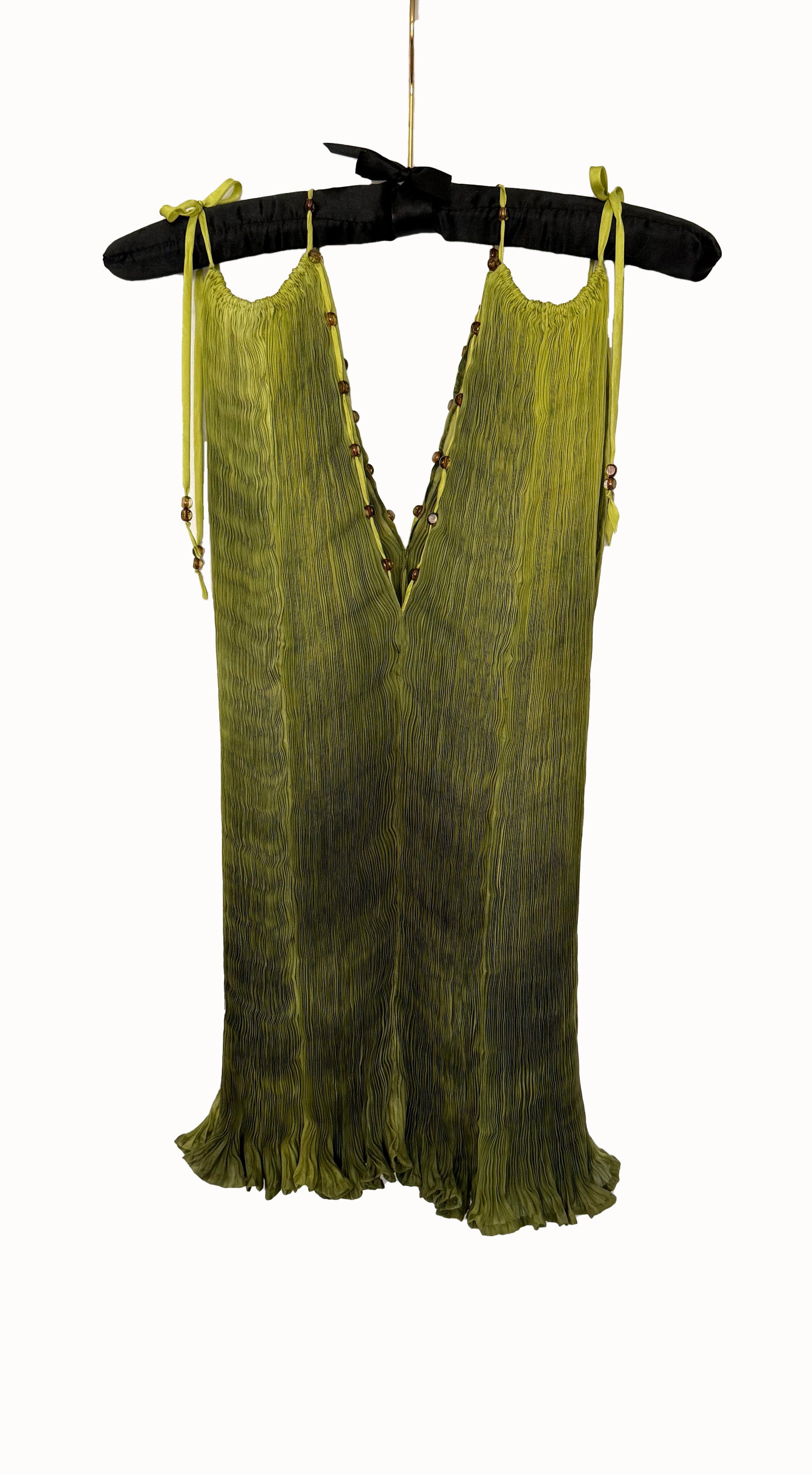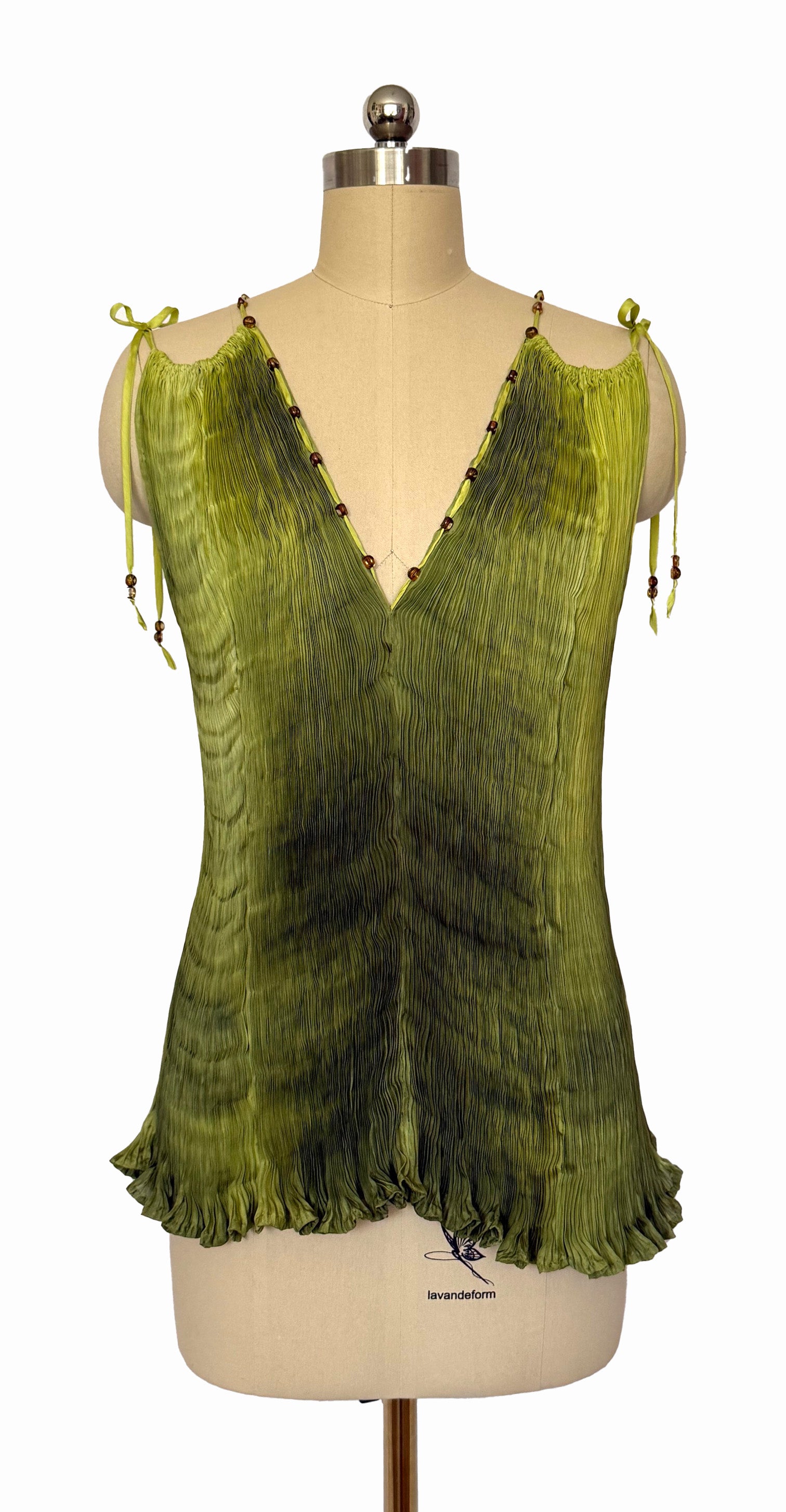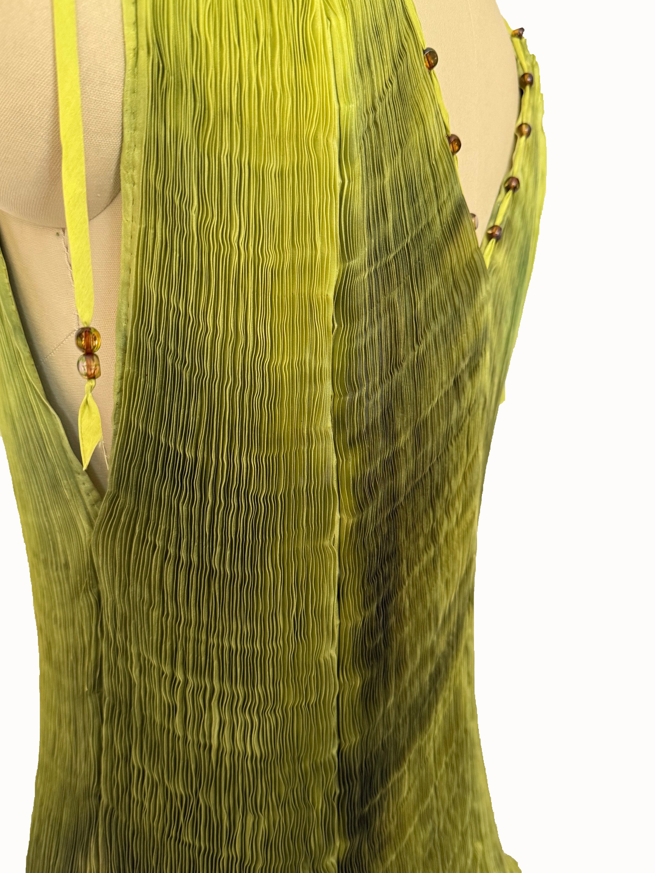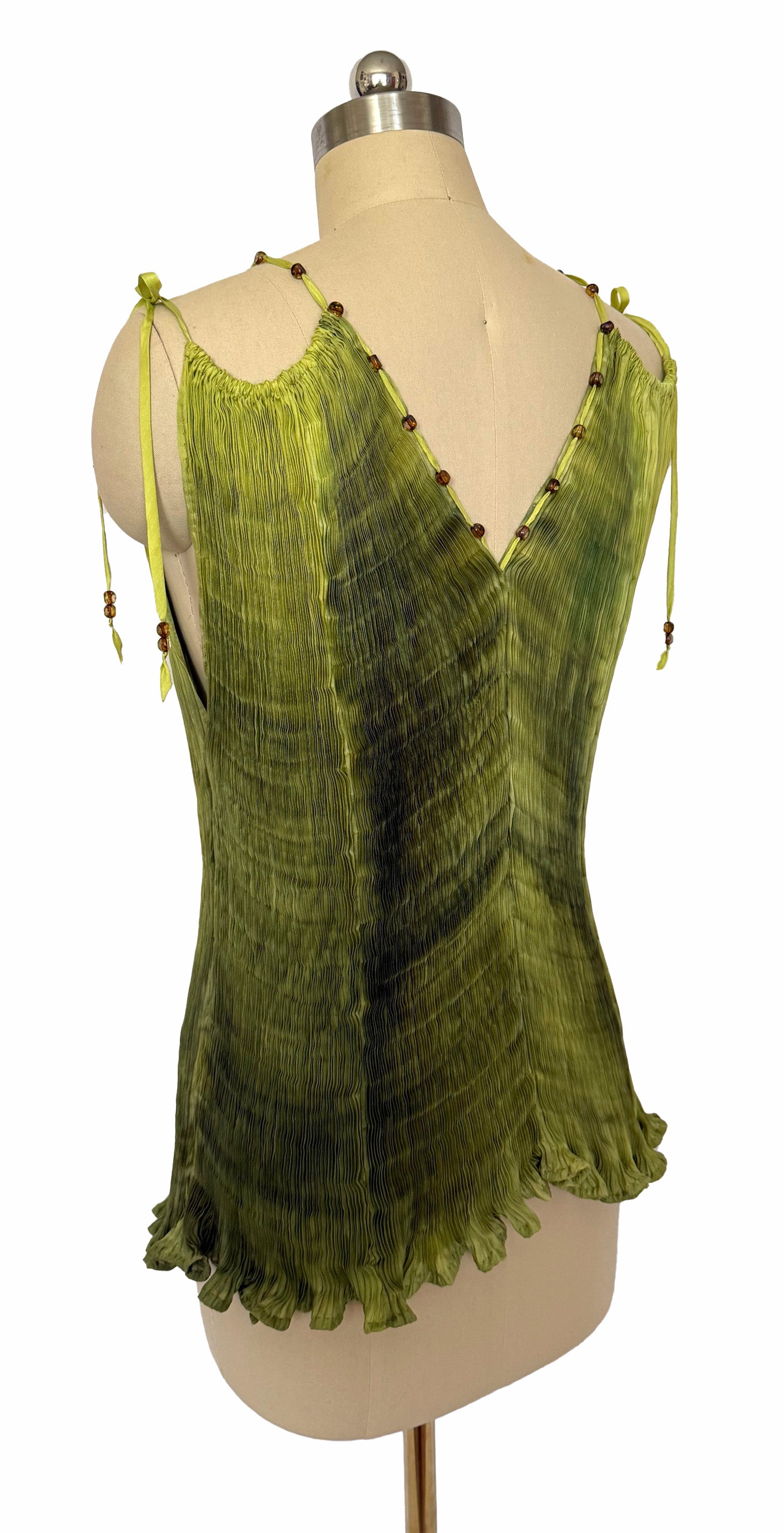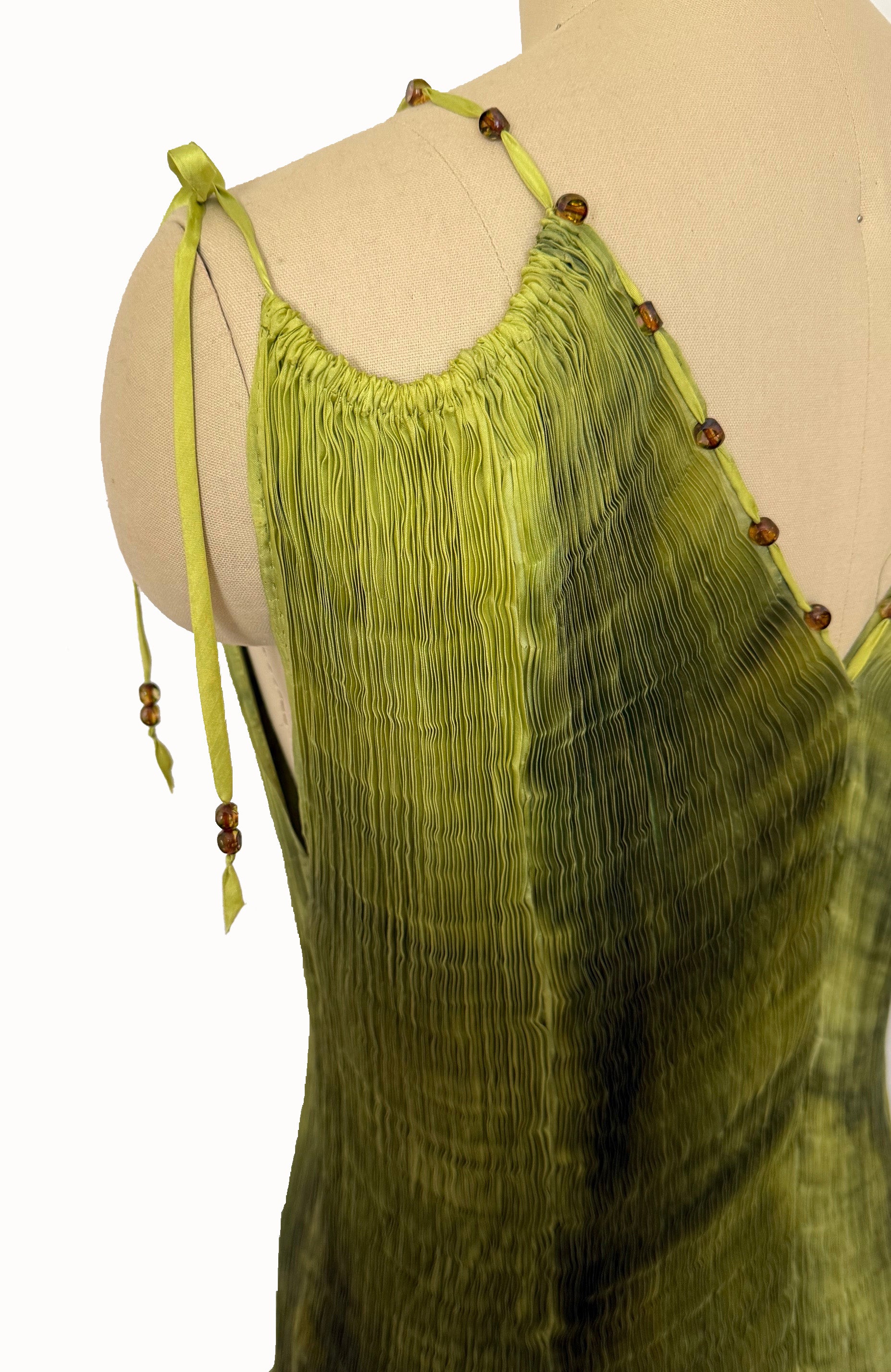 Hand-pleated silk tunic crafted from in-house dyed in varying shades of green with Czech glass beads.